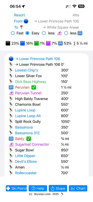 This is it he same route like on the map. By tapping on a leg of the route the system tries to avoid that run or lift. The radio buttons on the top may find a faster or easier route. The purple country skier means less cat walks.